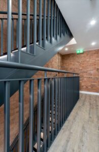Alongside the structural works, bespoke powder-coated metal staircases were fabricated to provide permanent access between floors once the fit-out was complete.