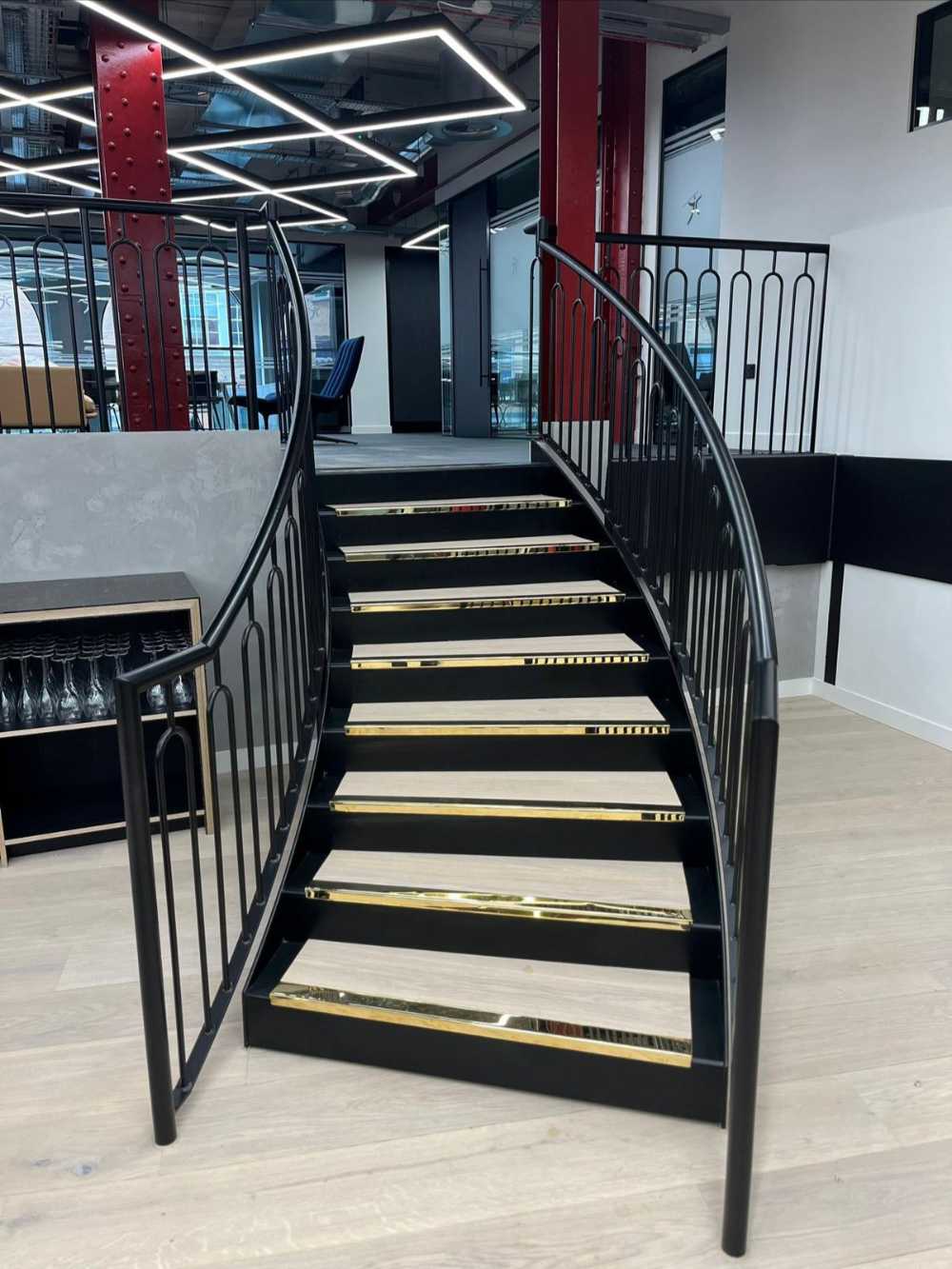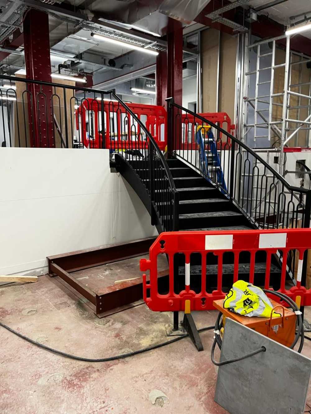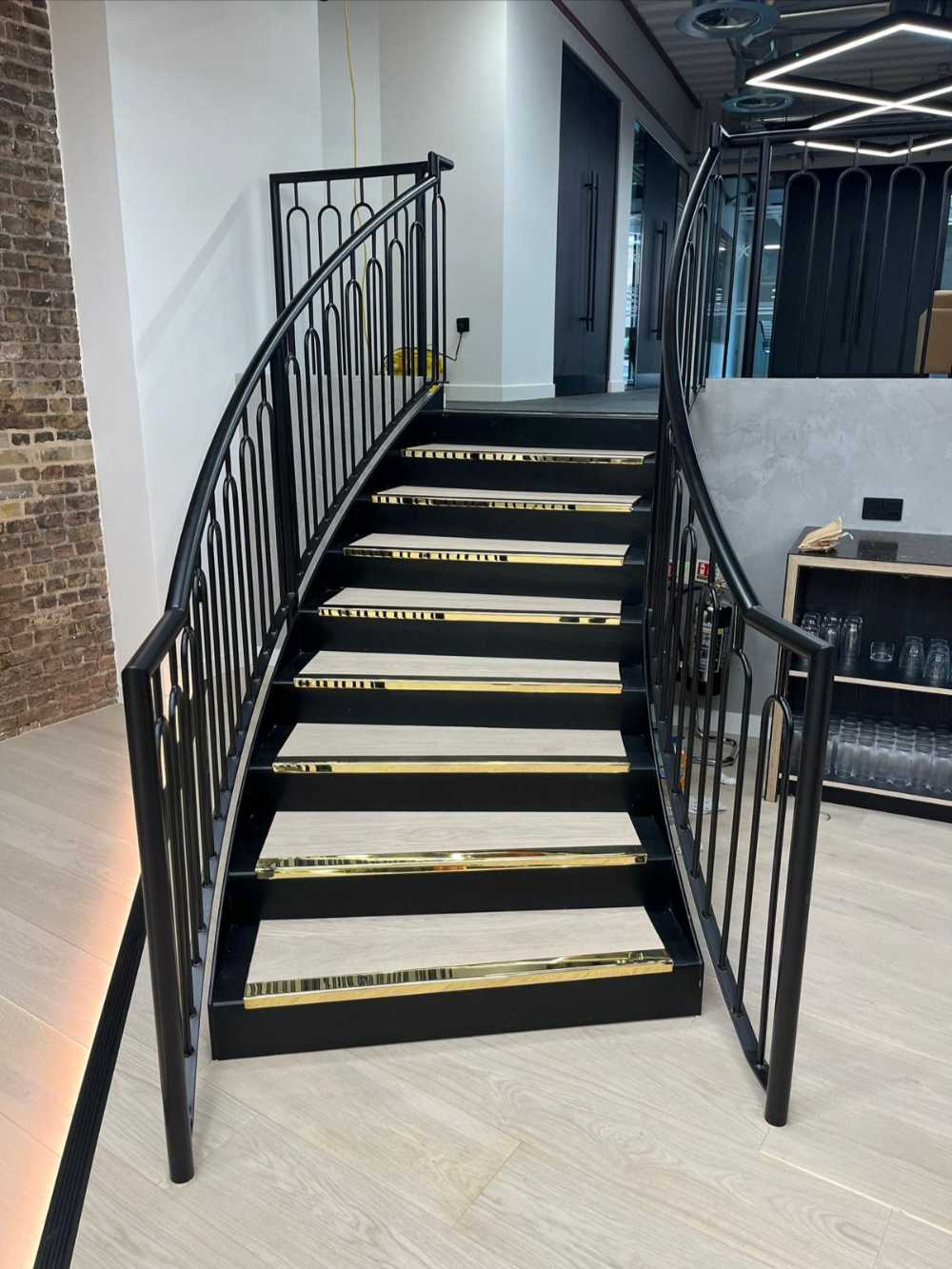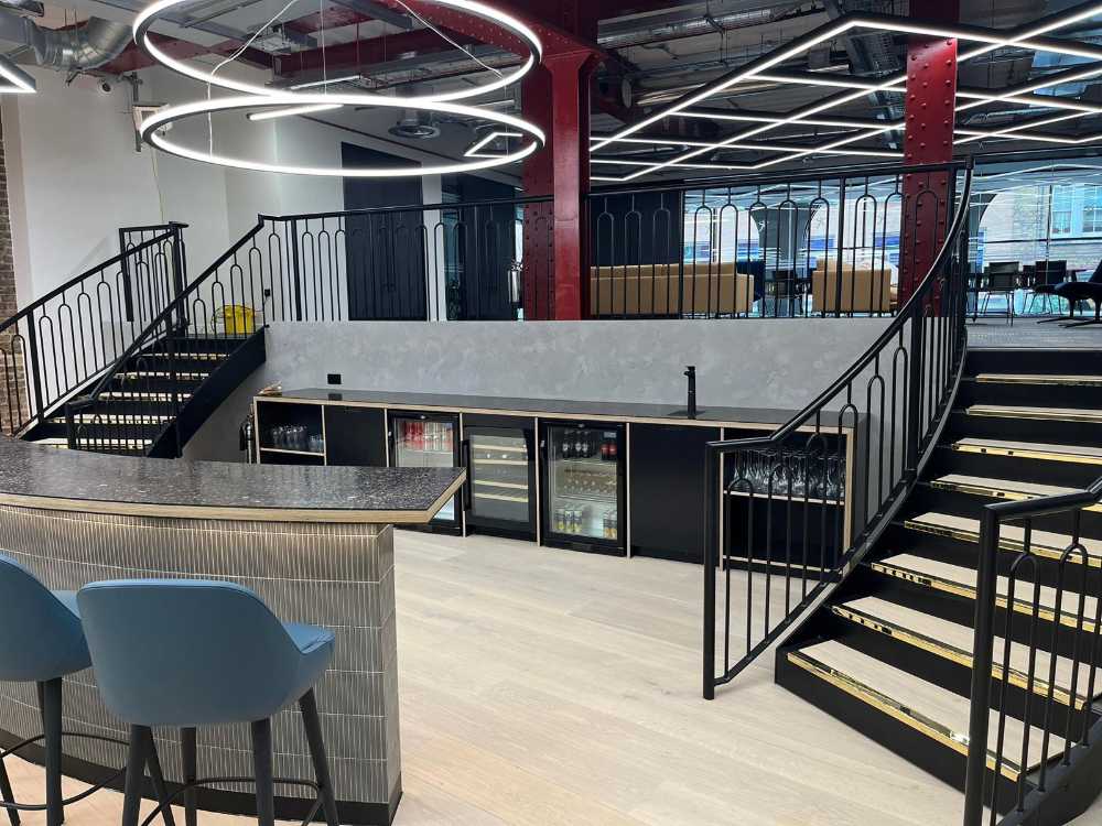 Blackburn & Co. Ltd was commissioned by a new client, The Workplace Partner, to survey, design, manufacture, and install two bespoke curved staircases connecting two first-floor levels in a commercial fit-out project.