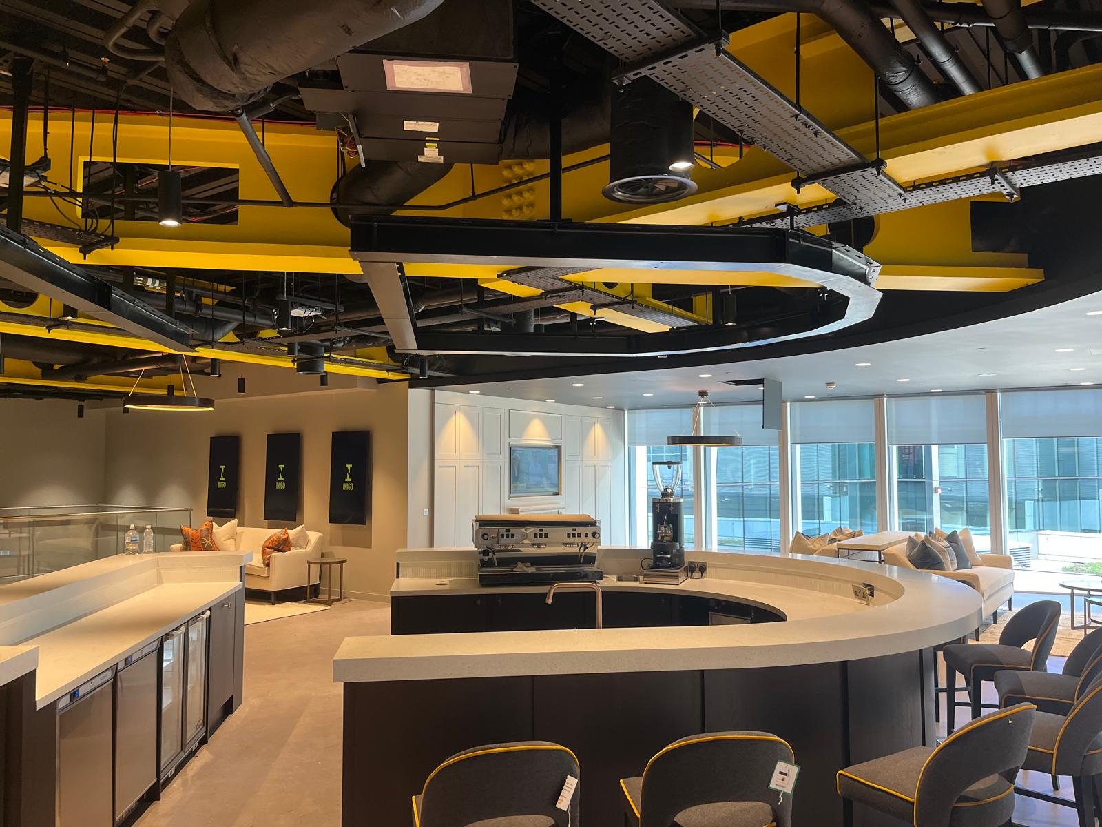 Installation required careful coordination to avoid existing ductwork and services. The frames were fixed securely to the ceiling soffit while maintaining alignment with the bar and counter below.